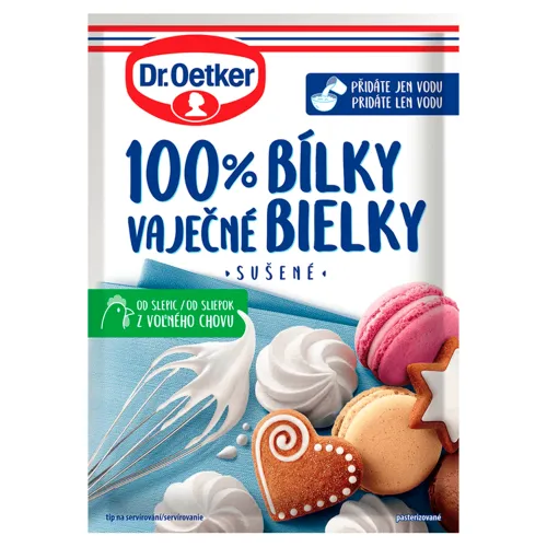 Prvotriedne 100% sušené vaječné bielky z chovu sliepok vo voľnom výbehu. Praktické použitie na pečenie a varenie. V práškovom stave ako zdroj kvalitného proteínu do koktailov a kaší. Alebo po vyšľahaní s vodou použiť ako čerstvý bielok na prípravu polevy alebo snehového cesta bez nutnosti oddeľovať žĺtky. Balenie zodpovedá 5 čerstvým bielkom.