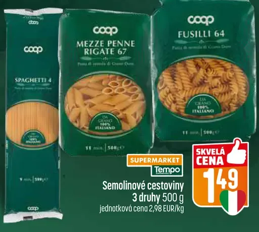 COOP Italia semolinové cestoviny spaghetti, mezze penne rigate, fusilli