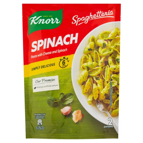 Zloženie: Zloženie v dehydratovanom stave:, Cestoviny 78% (krupica z tvrdej pšenice), Syrová zložka 4,7% (syr mozzarella, syr, syr s modrou plesňou, srvátka, syr crescenza, tvrdy syr), Sušená smotana 4,3%, Ryžová múka, Špenát¹ 1,8%, Jedlá soľ jódovaná (jedlá soľ, jodičnan draselný), Slnečnicový olej, Palmový tuk, Cukor, Extrakt z droždia, Arómy (obsahujú mlieko), Draselná soľ (chlorid draselný), Cesnak¹ 0,4%, Kurkuma, Laktóza, Glukózový sirup, Mliečne bielkoviny, Jedlá soľ, ¹Pestované udržateľným spôsobom