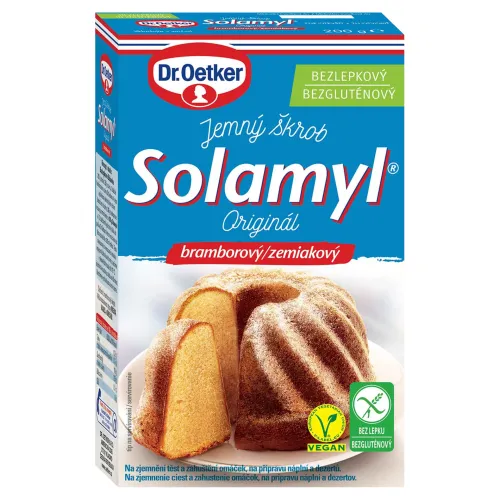 Prvotriedny jemný zemiakový škrob Dr. Oetker Solamyl. Tradičná kvalita, univerzálne použitie. Na zjemnenie cesta, zahustenie omáčok, prípravu náplní a dezertov aj pre ázijskú kuchyňu.