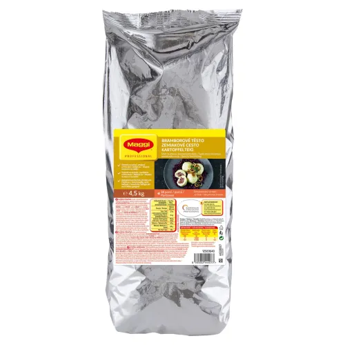 Príprava: Návod na prípravu: 1. Čerstvé vajcia rozmiešajte v studenej vode, pridajte zmes, dôkladne vypracujte cesto a nechajte 5 minút odpočívať. 2. Z cesta vytvarujte knedle s dĺžkou cca 20 cm a priemerom 5 cm alebo naplňte knedle mäsom, šunkou, vegetariánskou náplňou atď. 3. Knedle vložte do vriacej osolenej vody a varte 15 - 17 minút na miernej teplote. 4. Uvarené knedle vyberte z vody a servírujte. Ostatné pripravené jedlá varte podľa hrúbky zemiakového cesta. Po zovretí vody nadvihnite knedle od dna, aby sa neprichytili. Dávkovanie: 1000 g suchej zmesi + 1 l vody + 2 ks čerstvých vajec = 2 kg množstva cesta; 4500 g suchej zmesi + 4,5 l vody + 9 ks čerstvých vajec = 9,4 kg množstva cesta.