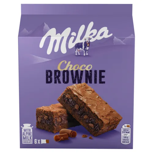 Milka Choco Brownie jemné pečivo s čokoládou, mliečnou čokoládou z alpského mlieka a kúskami mliečnej čokolády z alpského mlieka