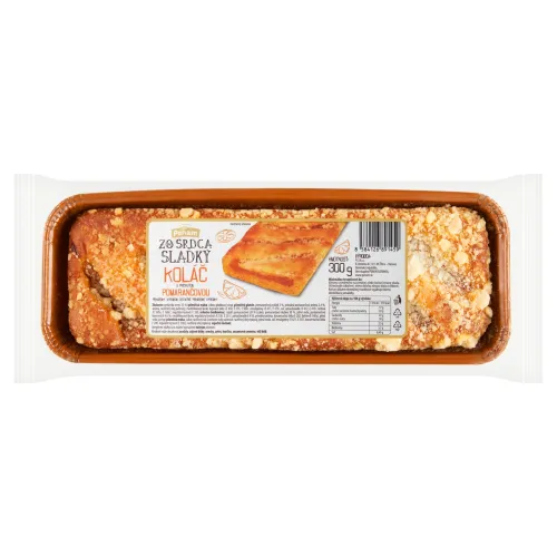 Zloženie: Pekárska zmes 35 % (pšeničná múka, cukor, glukózový sirup, pšeničný glutén, pomarančový prášok 3 %, prírodná pomarančová aróma 2,4 %, aróma, rastlinný olej palmový, modifikovaný škrob, kypriace látky /E 450, E 575, E 500/, emulgátory /E 471, E 475/, soľ, zahusťovadlá /E 412, E 415/, farbivá /E 160a, E 160c/, regulátor kyslosti E 330, mliečna bielkovina), Náplň pomarančová 20 % (cukor, pomarančová dužina 30 %, pitná voda, pomarančový koncentrát 4,6 %, modifikovaný škrob, regulátory kyslosti /E 330, E 331/, zahusťovadlo E 418, prírodná aróma, konzervačná látka E 202, farbivo E 160a), Pitná voda, Posyp [pšeničná múka, cukor, rastlinný tuk (rastlinné tuky palmové, rastlinný olej repkový, pitná voda, soľ, emulgátory /E 471, E 322/, konzervačná látka E 200, regulátor kyslosti E 330)], Rastlinný olej (repkový), Vaječná melanž