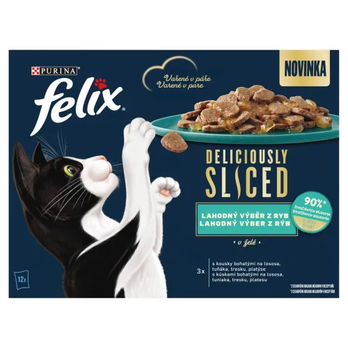 FELIX® Deliciously Sliced sú lahodné plátky starostlivo varené v pare s vysokým obsahom bielkovín, pokryté chutným želé, ktoré bude vaša mačka milovať! Vyzerajú, voňajú a chutia tak lahodne ako jedlo, ktoré by ste si možno sami pripravili!
