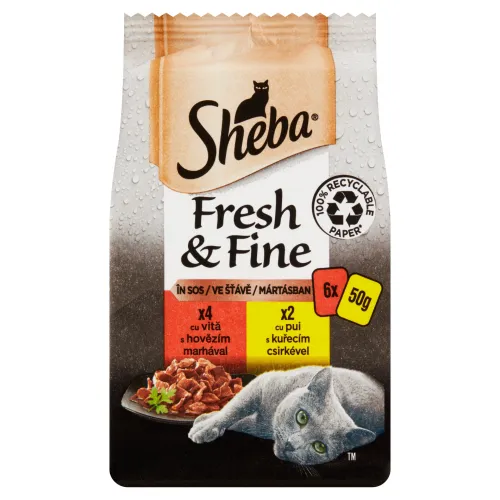 S radom krmív pre mačky SHEBA(r) Fresh & Fine môžete svojej mačke ľahko dopriať chute, ktoré si zamiluje, so skvelou kombináciou lahodných kúskov poskytujúcich kompletnú výživu pre vášho mačacieho spoločníka. Vyrobené z vybraných ingrediencií bez umelých farbív a konzervantov – úžasný spôsob, ako sa zblížiť s vaším mačacím kamarátom pri kŕmení. K dispozícii v kapsičkách krmiva pre mačky po 50g. Vhodné pre všetky mačky staršie než 12 mesiacov – dospelé a staršie