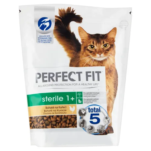 PERFECT FIT je pokročilá suchá mačacia výživa na podporu mladistvého ducha vašej mačky počas celého jej života. Vyvinuté v spolupráci s našimi veterinármi a špecialistami. Mačacie krmivo PERFECT FIT Total 5 Formula z radu PERFECT FIT pozitívne prispieva k zdraviu mačiek v 5 hlavných oblastiach a poskytuje komplexnú ochranu, a to bez ohľadu na ich vek či životný štýl. Výrobok PERFECT FIT Total 5 Formula prináša 5 benefitov a poskytuje mačkám komplexnú ochranu: • Zdravé trávenie • Silná prirodzená obrana • Zdravý močový trakt • Optimálna hmotnosť a fyzická kondícia • Zdravá koža a srsť Každý produkt mačacieho krmiva z nášho radu prináša tiež 3 ďalšie zdravotné benefity ušité na mieru špecifickým potrebám vašej mačky, takže si môžete byť istí, že jej poskytujete tú správnu výživu. Naše produkty mačacieho krmiva sú navyše vyrobené z kvalitných proteínov, takže vás môžeme uistiť, že vaše mačky ich budú zbožňovať! Mačacie krmivo PERFECT FIT Sterile 1+ s kuracím je špeciálne vyvinuté s cieľom podpory špecifických potrieb sterilných mačiek: • Udržiavanie optimálnej hmotnosti • Podpora obratnosti • Optimálne trávenie Všetky naše receptúry mačacích granúl PERFECT FIT boli vyvinuté v spolupráci s našimi veterinármi a špecialistami z centra pre výživu domácich maznáčikov Waltham, čím sa zaistí 100% kompletná, vyvážená a pokročilá výživa.