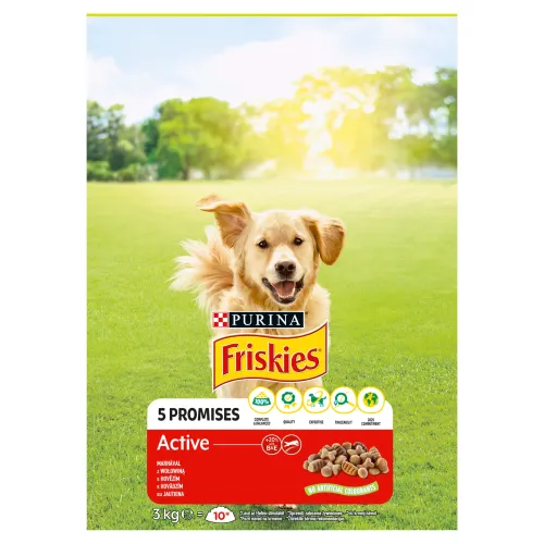 Friskies® Active je receptúra prispôsobená pre psov, ktorí sú plní energie a chcú sa vždy hrať.