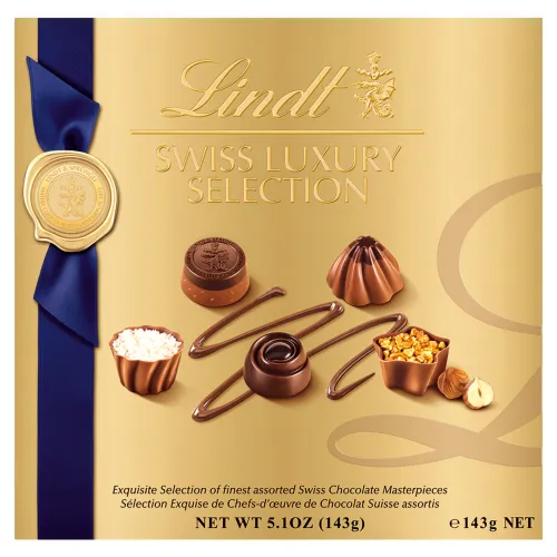 Zloženie: Cukor, Kakaové maslo, Kakaová hmota, Sušené plnotučné mlieko, Mandle, Lieskové oriešky, Kokosový tuk, Laktóza, Sušené odstredené mlieko, Glukózový sirup, Bezvodý mliečny tuk, Maslo, Kokosové vločky, Ryžová múka, Emulgátor sójový lecitín, Zahustené sladené mlieko, Extrakt z jačmenného sladu, Kakaový prášok so zníženým obsahom tuku, Kakaový prášok, Arómy, Morská jedlá soľ, Jedlá soľ, Maliny, Maltodextrín, Sušená klikva, Modifikovaný škrob, Zahusťovadlo: alginát sodný, Mliečna čokoláda: obsah kakaovej sušiny najmenej 31%. Obsah mliečnej sušiny najmenej 14%, Horká čokoláda: obsah kakaovej sušiny najmenej 44%