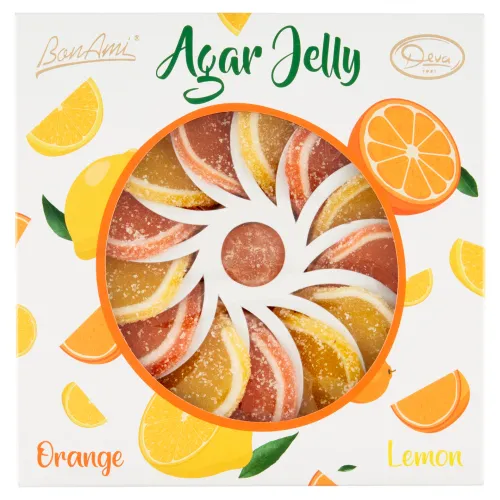 Zloženie: Cukor, Glukózový sirup, Želírujúca látka: agar, Kyselina kyselina citrónová , Sušené vaječné bielky, Farbivá: kurkumín a karmíny, Aróma pomarančová a citrónová