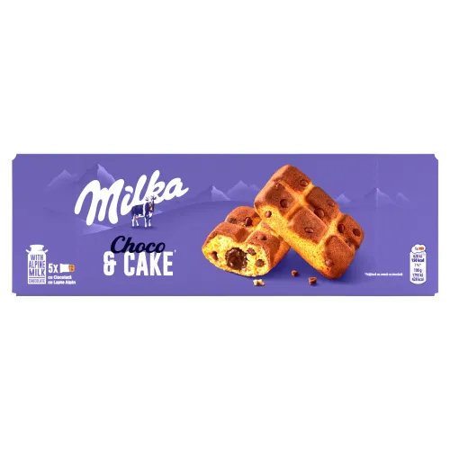 Milka Cake&Choc jemné pečivo s kúskami mliečnej čokolády z alpského mlieka a náplňou s čokoládou