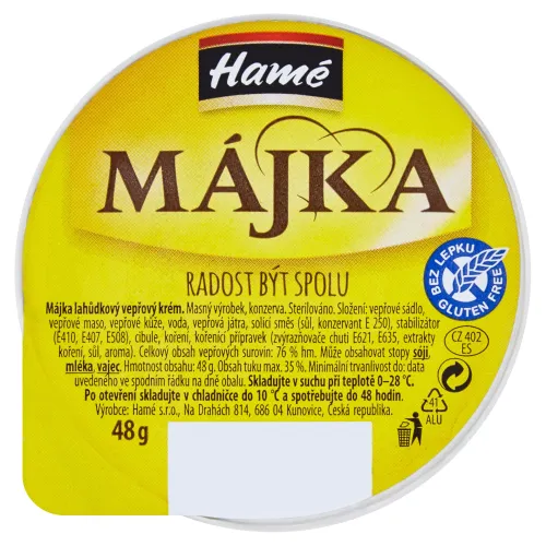 Zloženie: Slanina, Bravčové mäso, Bravčové kože, Voda, Bravčová pečeň, Soliaca zmes (soľ, stabilizátor E250), Stabilizátory (E410, E407, E508), Cibuľa, Koreniny, Koreniaci prípravok (zvýrazňovače chuti E621, E635, extrakty korenín, soľ, aróma), Celkový obsah bravčových surovín: 76 % hm., Obsah tuku max. 35 % hm