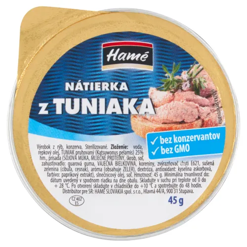 Zloženie: Voda, Repkový olej, Tuniak pruhovaný (Katsuwonus pelamis) 25% hm., Prísada (sójová múka, mliečne proteíny, škrob, soľ, zahusťovadlo: guarová guma, vaječná bielkovina, koreniny, zvýrazňovač chuti E621, sušená zelenina (cibuľa, cesnak), aróma (obsahuje zeler), dextróza, antioxidant: kyselina askorbová, farbivo: paprikový extrakt) , Slnečnicový olej, Soľ