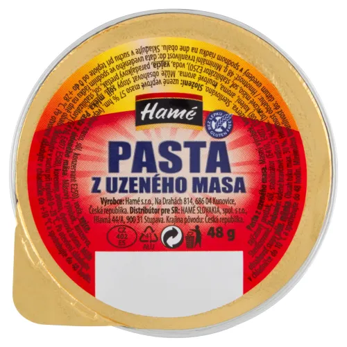 Údené bravčové mäso 57% hm. (bravčové mäso, soľ, stabilizátor E250), Voda, Vajcia, Paradajkový pretlak, Soľ, Stabilizátory (E410, E407, E508), Koreniny, Aroma, Dymová aróma, Obsah tuku max. 30 % hm.