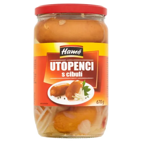 Zloženie: Údenina 47,8% hm. (mechanicky separované hydinové mäso, bravčové mäso, voda, slanina, bravčové kože, soliaca zmes (soľ, stabilizátor E 250), zemiakový škrob, koreniaci prípravok (glukózový sirup, stabilizátor E451, zvýrazňovače chuti E621, E 325, antioxidant E 316, extrakty korenín), cesnak), Voda, Kvasný liehový ocot, Cibuľa 15% hm., Cukor, Soľ, Paprika, Horčičné semeno, Bobkový list , Obsah tuku v údenine max. 40 % hm.